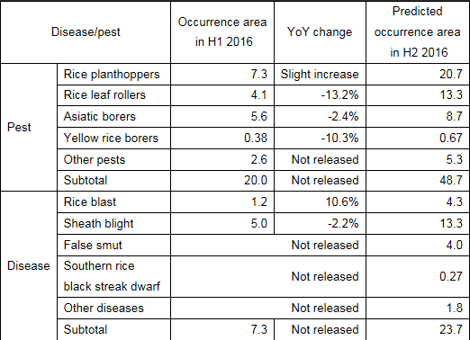 In the first half of 2016, major rice diseases and pests stroke seriously in the southern rice production areas, with an accumulative area of 27.3 million ha, among which those of pests and diseases were 20.0 million ha and 7.3 million ha respectively.